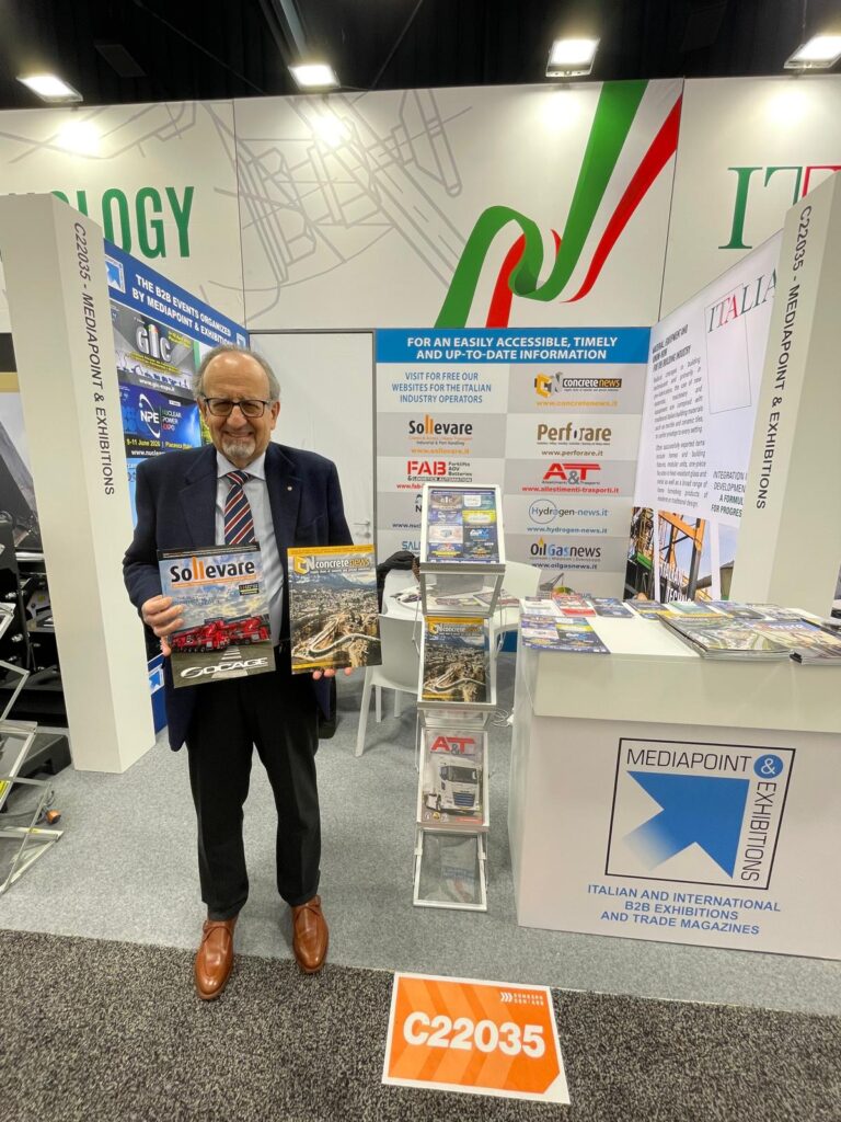 La presenza di Mediapoint & Exhibitions a Conexpo 2026 “Siamo in prima linea, doverosamente, alla manifestazione di Las Vegas, la più importante degli Stati Uniti nel settore delle costruzioni, con uno stand dedicato e ricco di contenuti – sottolinea Fabio Potestà, direttore di Mediapoint & Exhibitions, mentre affronta la prima giornata di Conexpo 2026 – Portiamo in questa fiera internazionale il valore editoriale delle nostre riviste specializzate sul macrosettore del calcestruzzo e delle cave, sul sollevamento, sulle perforazioni e fondazioni speciali, sulla logistica industriale e sull’idrogeno. Portiamo la voce e l’impeto promozionale delle nostre fiere dal respiro europeo (a questo proposito, è stata appena annunciata, dallo stesso Fabio Potestà, in diretta da Las Vegas, la prossima edizione del GIS 2027, le Giornate Italiane del Sollevamento e dei Trasporti Eccezionali, che migrano da Piacenza Expo a Fiere di Parma – dal 7 al 9 ottobre 2027) – a testimonianza della nuova fase di evoluzione organizzativa della fiera, ndr.) e l’importanza delle aziende italiane, che ci onoriamo di rappresentare e supportare con il massimo impegno, a beneficio di una sempre maggiore rilevanza del made in Italy nel novero dei valori dell’industria americana delle costruzioni”.