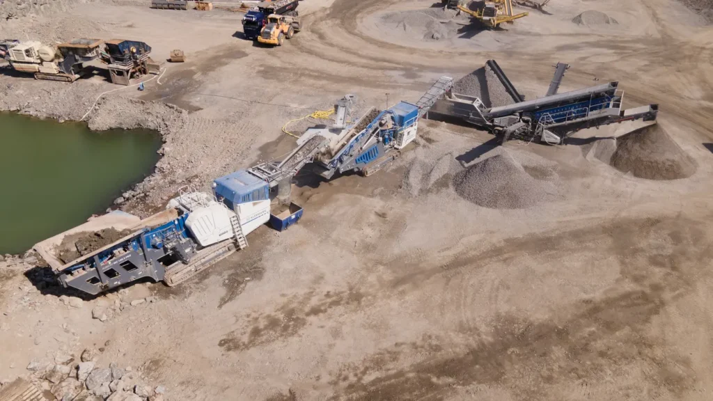 Il materiale, frantumato con una granulometria di 0 – 150 mm, passa al frantoio a cono, quindi con 0 – 60 mm va all’impianto di vagliatura e classificazione mobile, dove viene separato in tre granulometrie: 0 – 16 mm, 16 – 32 mm e >32 mm.